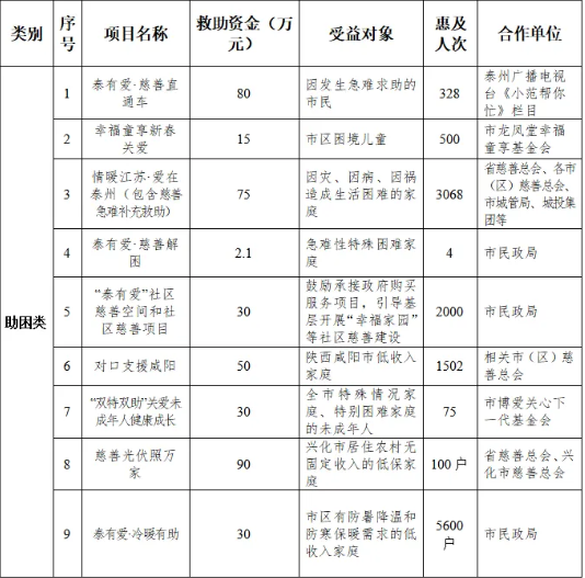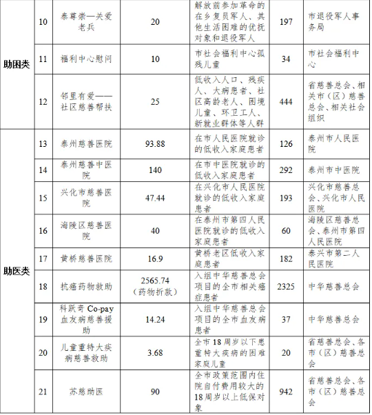 根据《中华人民共和国慈善法》《泰州市慈善总会章程》的有关规定,泰州市慈善总会积极履行慈善为民担当,优化项目设置,严格规范实施,坚持精准帮扶。2025年度共实施慈善救助项目27个,支出救助资金3652.16万元(含药物折款),惠及20713人次。现将项目实施情况公告如下,敬请广大市民监督。